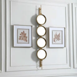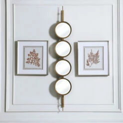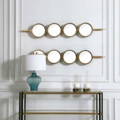 Contemporary in style, this mirror features a sleek iron base with linear metal accents. the piece is finished in gold leaf with four round beveled mirrors. Group multiple pieces together and hang horizontal or vertical to create a truly unique wall feature.