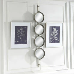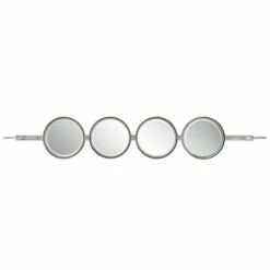 Contemporary in style, this mirror features a sleek iron base with linear metal accents. The piece is finished in silver leaf with four round beveled mirrors. Group multiple pieces together and hang horizontal or vertical to create a truly unique wall feature.