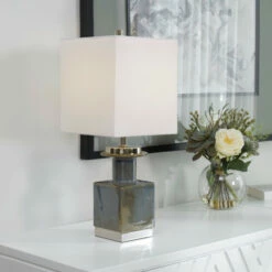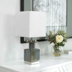 This accent lamp displays a unique artisan look with its ceramic base finished in a variegated grey and taupe glaze with pops of cobalt blue, paired with polished nickel plated accents. The hardback square shade is covered in white fabric.