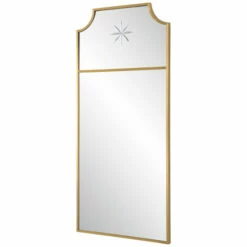 Inspired by trumeau styling, this updated traditional mirror displays a petite stainless steel frame finished in satin brushed brass, displaying an etched medallion motif.