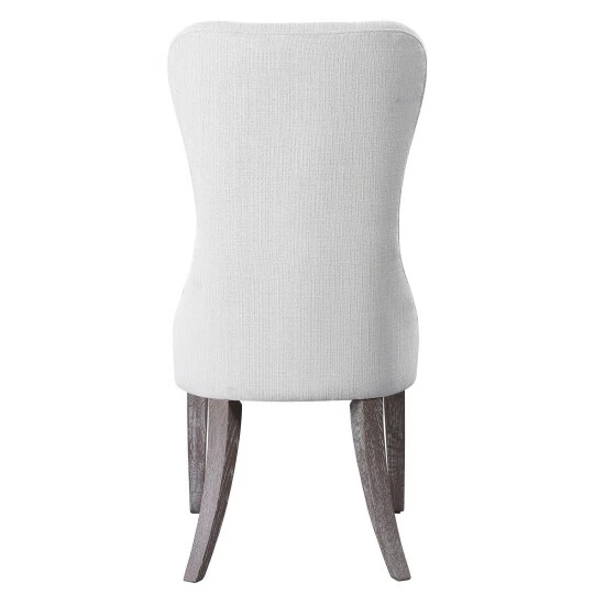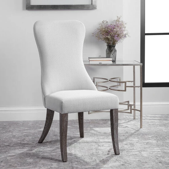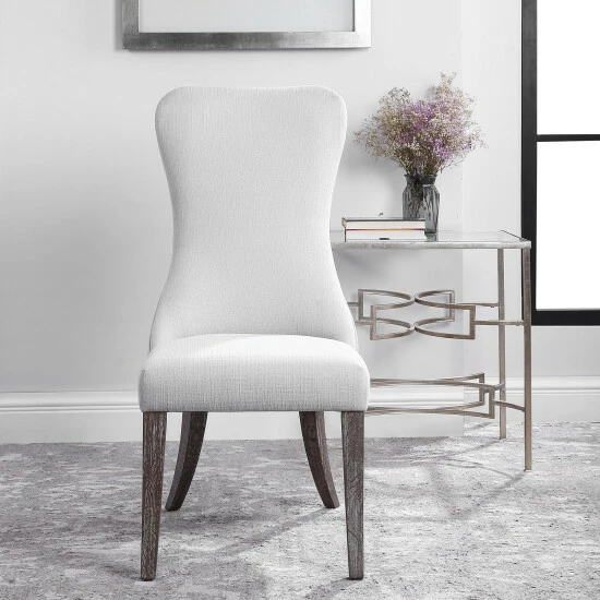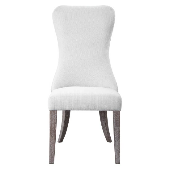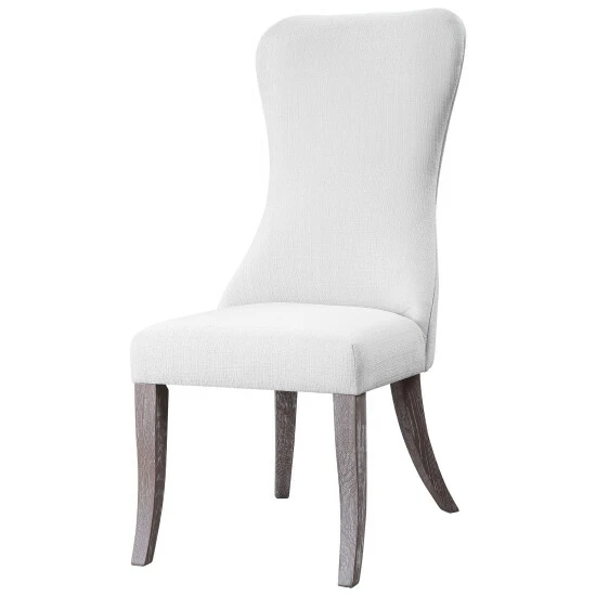 Perfect for a French country or farmhouse setting, this armless chair features a feminine silhouette finished in a white slubbed performance fabric with wire-brushed solid oak legs finished in dark walnut with a light grey wash.