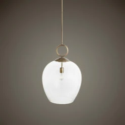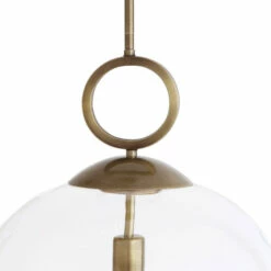Simple elegance best describes the extra-large clear blown glass on this transitional pendant. Calix features an aged brass metal finish which has an ombre effect giving a deeper hue of antique darkening to some areas and brightening on others. The large circle accent above the glass adds a bold graphic element.
