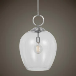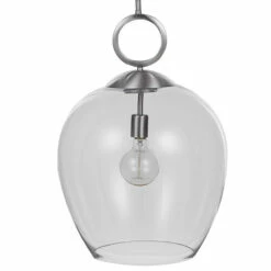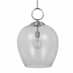 Simple elegance best describes the extra-large clear blown glass on this transitional pendant. Calix Nickel features a brushed nickel metal finish. The large circle accent above the glass adds a bold graphic element. With 1-100 watt max Edison socket. Includes 15 feet wire, and 3-12 inches stems and 1-6 inches stem for adjustable installation.