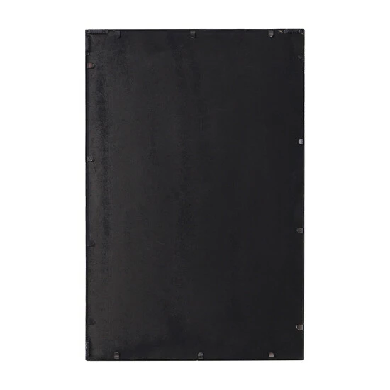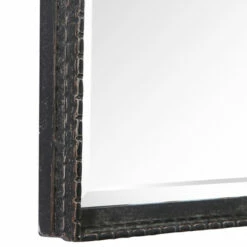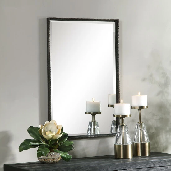 This simple vanity mirror features an iron construction with detailed edges. The slight profile frame is finished in a distressed rustic bronze with aged gold highlights. This mirror may be hung horizontal or vertical.