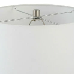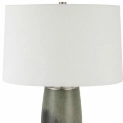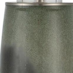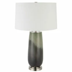 This elegant table lamp features a beautiful speckled green and gray-blue ombre glass base with crystal accents and brushed nickel finished iron details. The hardback shade has a slight taper and is covered in a white cotton fabric.