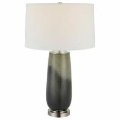 This elegant table lamp features a beautiful speckled green and gray-blue ombre glass base with crystal accents and brushed nickel finished iron details. The hardback shade has a slight taper and is covered in a white cotton fabric.