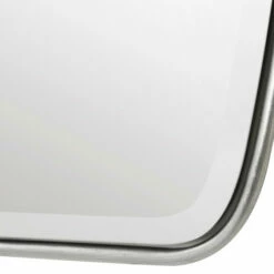 This shaped mirror frame is forged from rounded metal finished in a lightly antiqued silver leaf featuring a floating beveled mirror. May be hung horizontal or vertical.