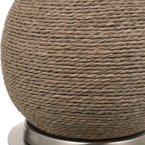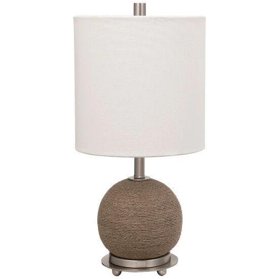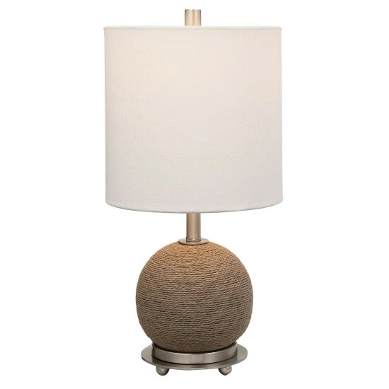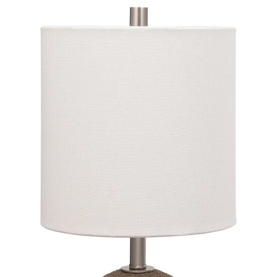 This accent lamp features a casual, natural braided rattan wrapped exterior accented by brushed nickel plated iron details. A hardback shade in a crisp white linen fabric compliments the piece.