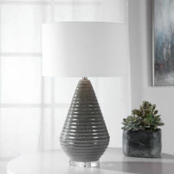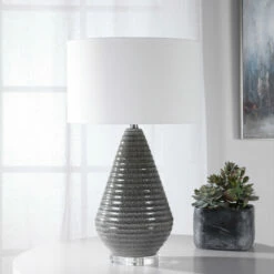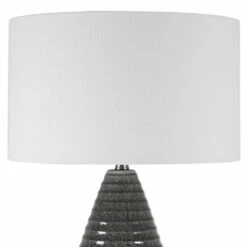 Showcasing a tapered ceramic base with ribbed texture, this transitional table lamp is finished in a smoke grey crackle glaze with a thick crystal foot and brushed nickel accents. The lamp is accented by a white linen drum shade with light slubbing.