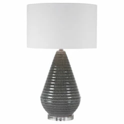 Showcasing a tapered ceramic base with ribbed texture, this transitional table lamp is finished in a smoke grey crackle glaze with a thick crystal foot and brushed nickel accents. The lamp is accented by a white linen drum shade with light slubbing.