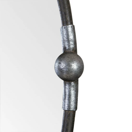 This Carrick mirror features a narrow iron frame, finished in rust black with burnished silver accents. May be hung horizontal or vertical.