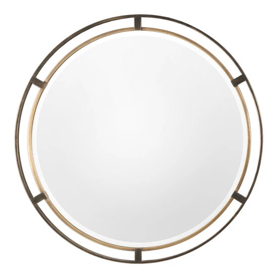 Brighten your space with the chic allure of this Uttermost Carrizo mirror. The round mirror features a three-dimensional double iron frame that lends a hint of nautical, industrial flair to the design. The two-tone rustic bronze finish completes the eye-catching charm of this beautiful mirror.