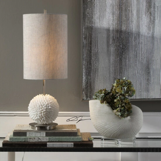 This decorative sphere is hand crafted with faux sea shells, accented with brushed nickel plated details. The round hardback drum shade is a light beige linen fabric with natural slubbing.