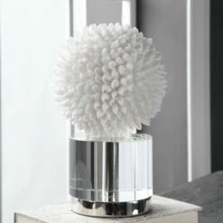 This decorative sphere is handcrafted with faux sea shells, accented with polished nickel plated accents and cylinder shaped crystal base.
