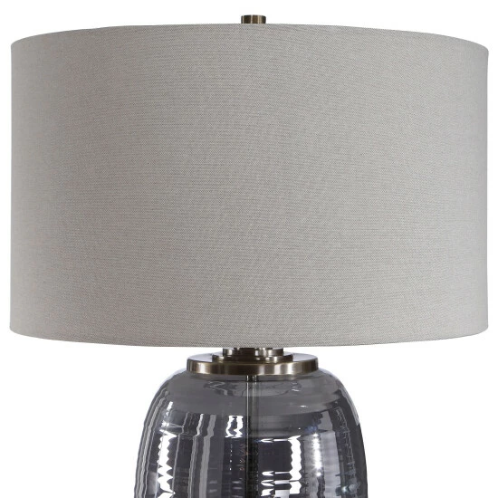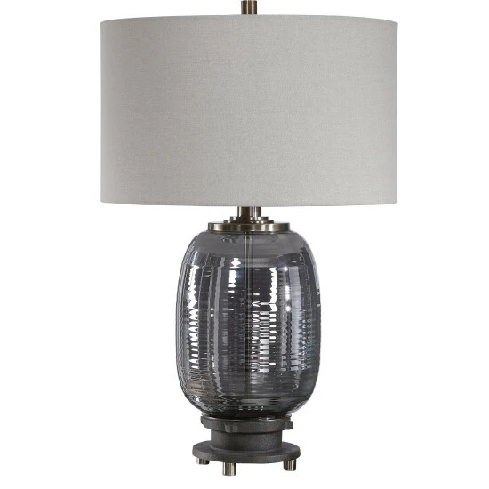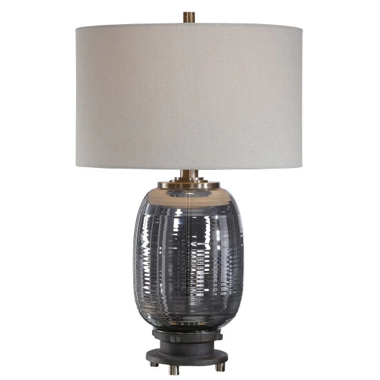 This contemporary table lamp has an iridescent amber glass base with a wavy textured surface. Steel accents are finished in brushed brass and a cast iron, aged rust black foot completes this design. The round hardback drum shade is a light beige linen fabric.