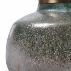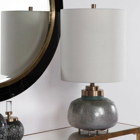 Buffet lamp features an iridescent art glass base with a hand crafted look, featuring shades of green with a rust grey wash, gold highlights and plated antique brass accents. The lamp is paired with a round hardback shade in a light beige linen fabric.