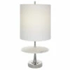 The Claudina lamp is defined by its crudely grooved frosted blue glass base, with polished nickel plated accents and crystal details. The round hardback drum shade is a crisp off-white linen fabric.
