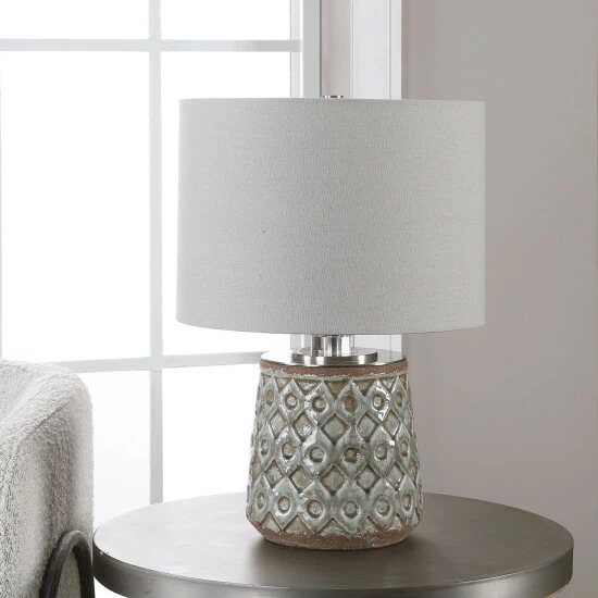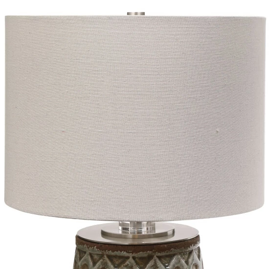 A transitional take on an old world look, this ceramic table lamp features a heavily distressed blue-grey crackle glaze with intricate embossed geometric details, accented with brushed nickel details and a thick crystal collar. A light grey linen fabric shade completes the look.
