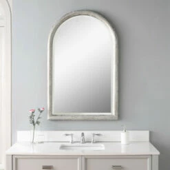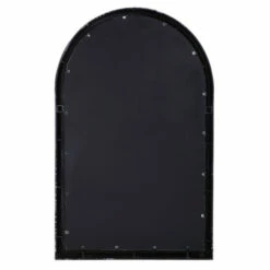 Arch mirror features a forged iron frame with noticeable texture finished in aged grey with distressing and mottled silver highlights. Mirror has a generous 1 1/4 inches bevel.