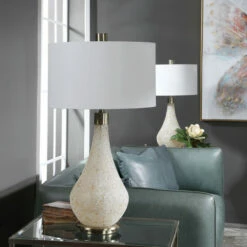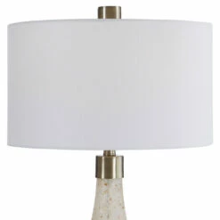This table lamp features a heavily textured art glass base in shades of cream, ivory, and rust brown, accented with brushed antique brass plated details. The hardback drum shade is a white linen fabric.