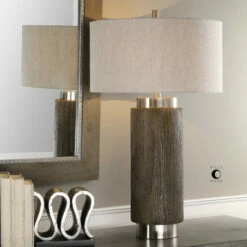 This lamp mixes a contemporary feel with stacked cylinder shapes and a strong rustic design with the faux wood base, finished in an old driftwood stain, accented with a rottenstone glaze and brushed nickel plated details. The round hardback drum shade is a khaki linen fabric with natural slubbing.