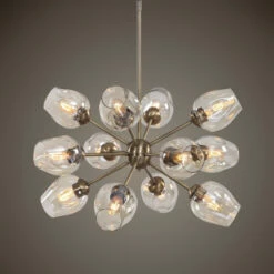 Transitional with a flair of Mid Century sputnik style, our 12 lights rod hung chandelier, features a warm antique brass finish with plated amber dimpled glass shades; 12-60 watt max Edison sockets and includes 12-40 watt clear T45 bulbs. Supplied with 15 feet wire, and 3-12 inches stems and 1-6 inches stem for adjustable installation.