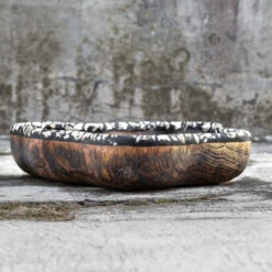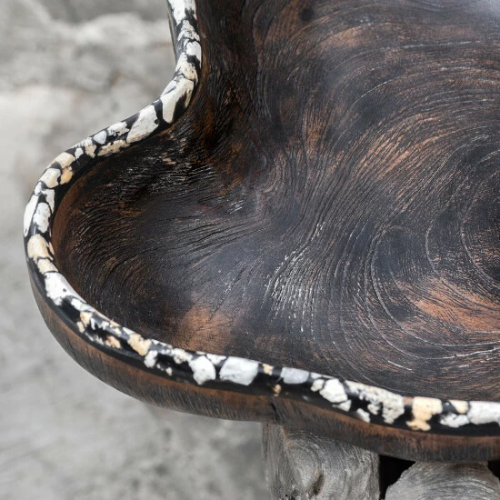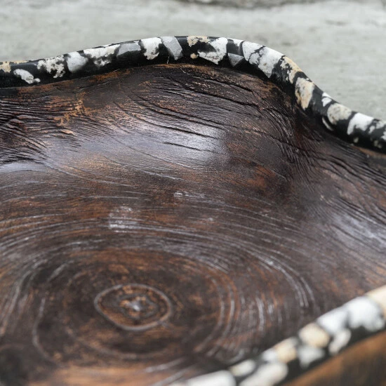 Made of natural teak wood with a charcoal wash, each piece is handcrafted making it unique. Black and white rim details add a bohemian element to the design. Cracks and variations in the grain are normal.