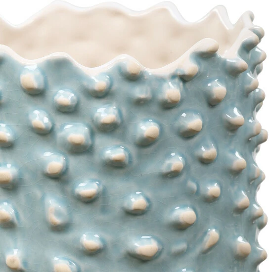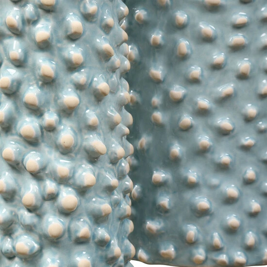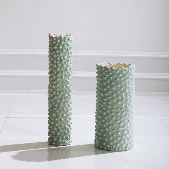 Set of two, aqua ceramic vases with heavy exterior texture and an ivory interior glaze.