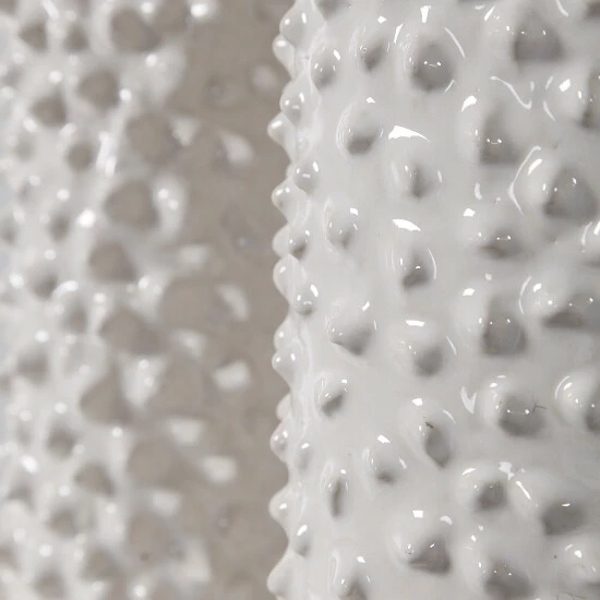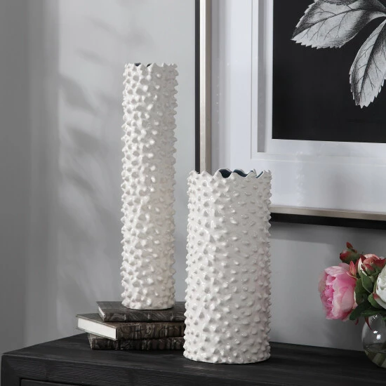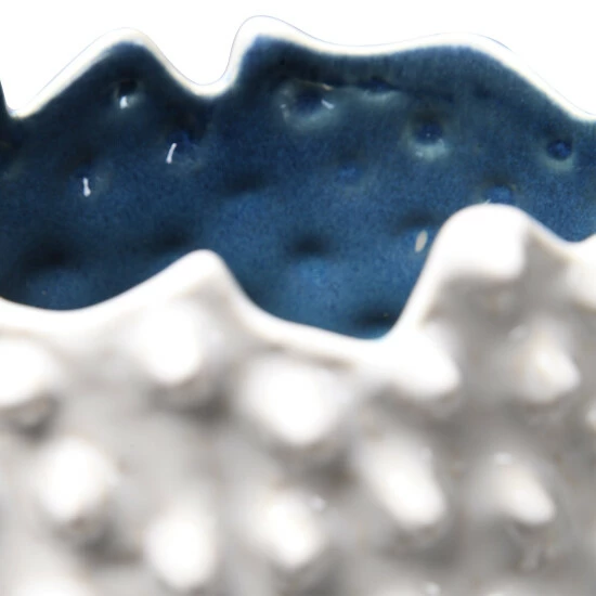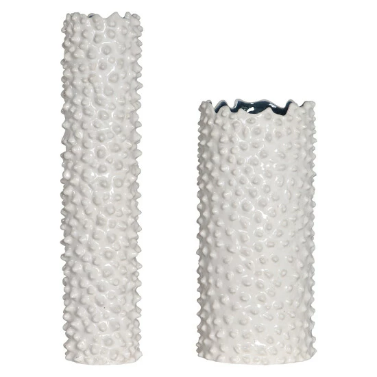 Set of two, white ceramic vases with heavy exterior texture and a bright blue interior glaze.