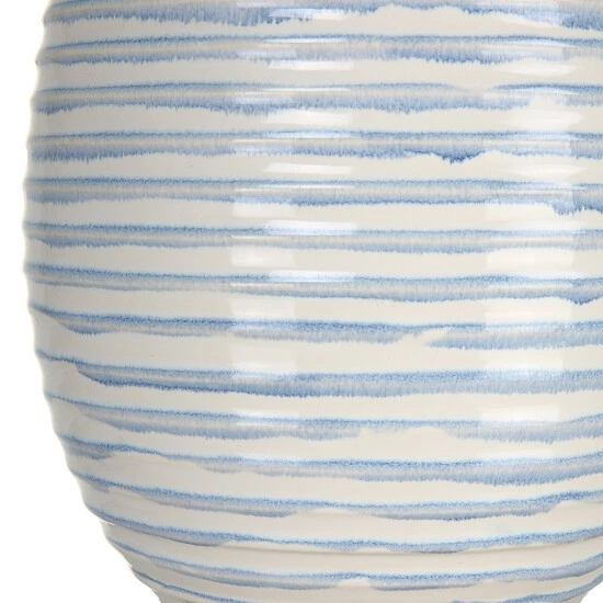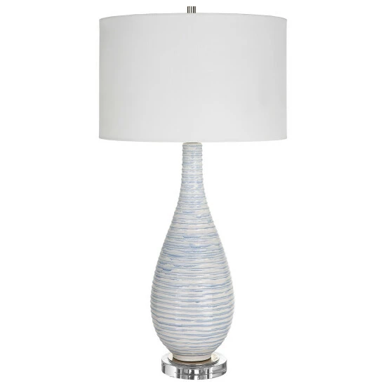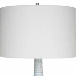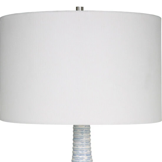 This ceramic table lamp features an elegant fluted shape with ribbed texture finished in a soft blue and white drip glaze. The lamp sits on a thick crystal foot paired with polished nickel plated details. A white linen drum shade compliments the piece.