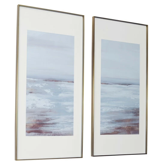 These refined coastal prints are an abstract take on a waterfront scene. Light blue and grey tones are highlighted by rust brown and gold accents. Each image is placed under glass with a brushed gold frame and large white mat. Artwork by Eva Watts.