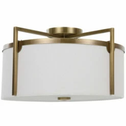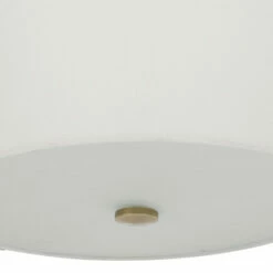 Chic and versatile with clean lines this 3-light semi flush mount features an antique brass finish with off white linen hard back shade with a central frosted glass diffuser. 3-100 watt max edison sockets.