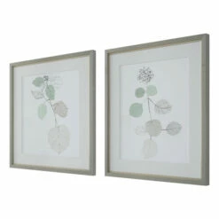 This versatile pair depicts delicate botanicals in soothing sage, navy, and neutral tones. Each print is under glass and accentuated by an off-white linen mat and gray wood tone frame with a petite champagne liner. Artwork by Flora B.