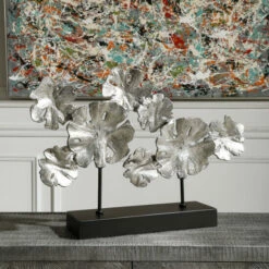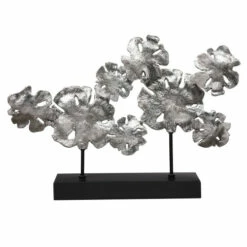 Inspired by lotus flowers, this sculpture is finished in a contemporary silver leaf with noticeable texture and distressed details. the piece is supported by an iron foot finished in matte black.