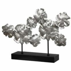 Inspired by lotus flowers, this sculpture is finished in a contemporary silver leaf with noticeable texture and distressed details. the piece is supported by an iron foot finished in matte black.
