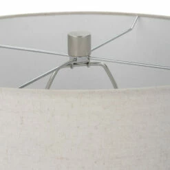 This table lamp features a graceful tapered base crafted from artisanal blue-green metallic glass. Iron accents are finished in brushed nickel. The drum shade is covered in a light oatmeal fabric with natural slubbing.