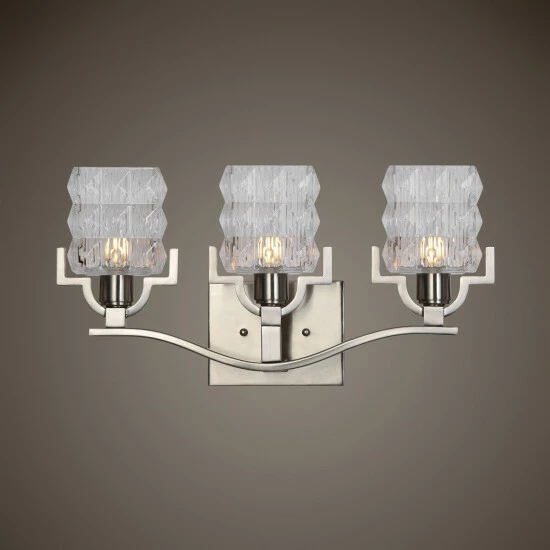 Transitional 3-light vanity of brushed nickel with clear textured rectangular glass and clean lines. Includes 3-40w G9 halogen bulb.