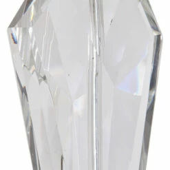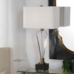 This contemporary piece showcases an elegant design with clean lines and sophisticated elements featuring a geometric crystal base that’s accented with antique brass plated details. The rectangle hardback shade is a white linen fabric.