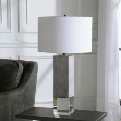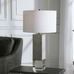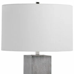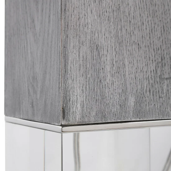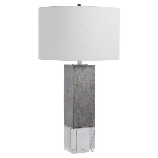 Inspired by modern lodge style, this table lamp features a light grey oak look, accented by polished nickel plated details and a crystal foot that elevate the sophisticated design. The lamp is paired with a white hardback drum shade.