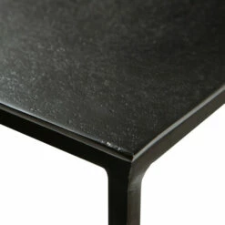 Functional nesting pedestals constructed in an aged black iron, featuring a textured cast aluminum slab top finished in a plated antique bronze.
