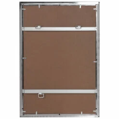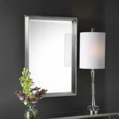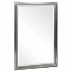 Versatile in design, this vanity mirror displays a simple rectangular shape. The mirror is finished in brushed silver and has a framed accent that adds dimensional interest.