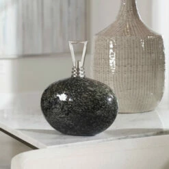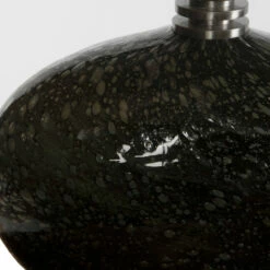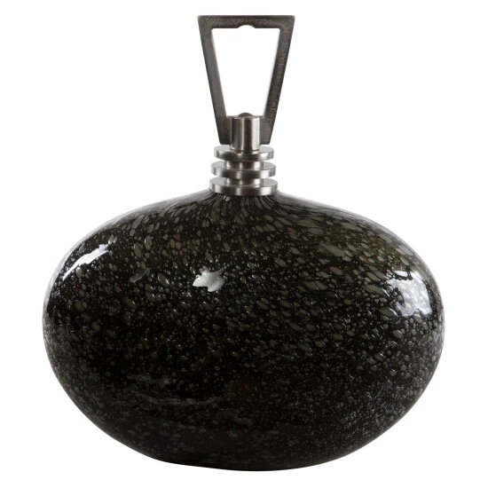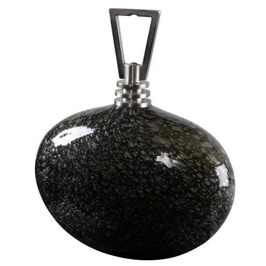 Showcasing a masculine look, this bottle features an ebony and charcoal bubble glass base accented by a contemporary brushed nickel plated iron lift-off stopper.