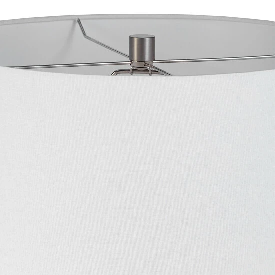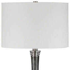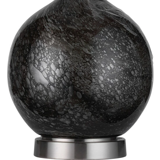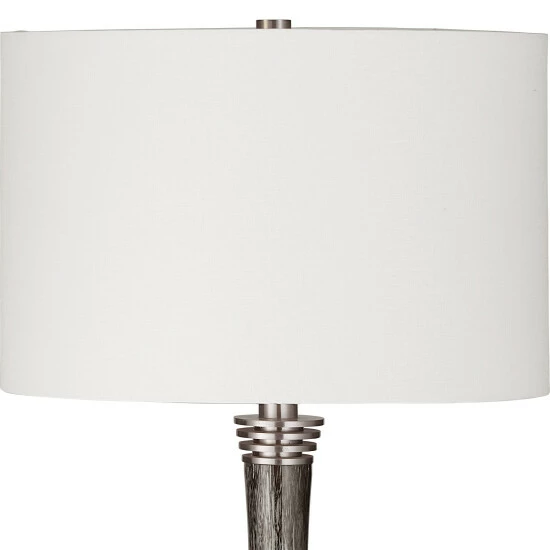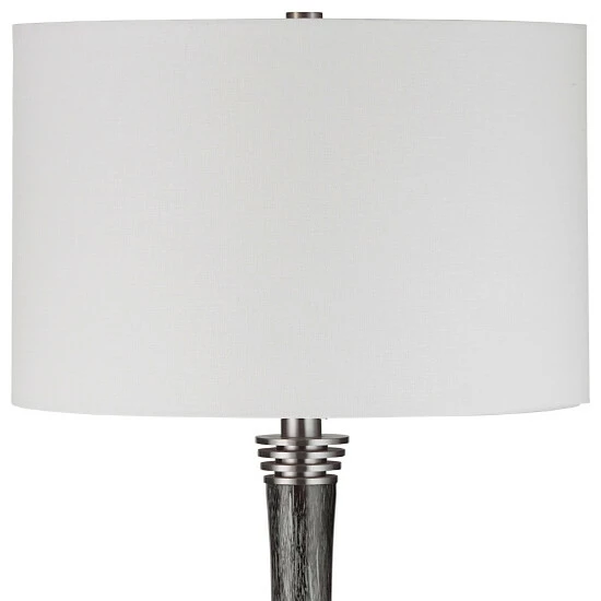 Showcasing a masculine look, this buffet lamp features an ebony and charcoal bubble glass base accented by contemporary brushed nickel plated iron details. The lamp is paired with a hardback drum shade that is covered in a white linen fabric.