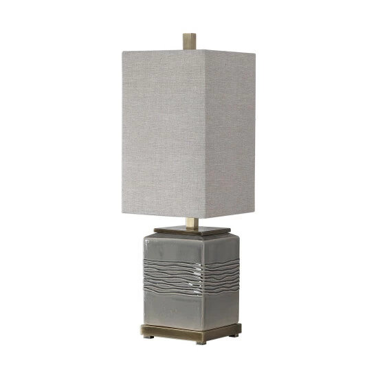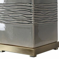 A contemporary style emanates from this ceramic base that features wavy embossing that has a subtle organic feel, finished in a warm grey glaze, accented with plated antique brass details. A rectangular hardback shade in light beige linen with natural subbing compliments this piece.