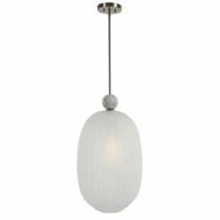Grand oversized elongated 1-light pendant with a generously proportioned etched melon glass shade featuring a substantial white marble accent and a refined brushed nickel finish. With 1-100 watt max, Edison socket and includes 15 feet wire, 3-12 inches stems and 1-6 inches stem for adjustable installation.