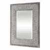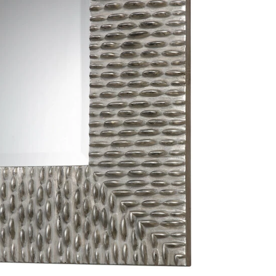 Frame is adorned with rows of raised, staggered beading details, all of which are finished in distressed metallic silver leaf with black undertones and a light grey wash. Mirror features a generous 1.25-inch bevel.
