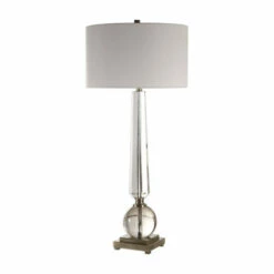 This elegant lamp features a tapered cut crystal column, displayed with a thick crystal sphere, creating a timeless design that’s paired with brushed nickel plated details for an updated appeal. The round hardback drum shade is a white linen fabric.