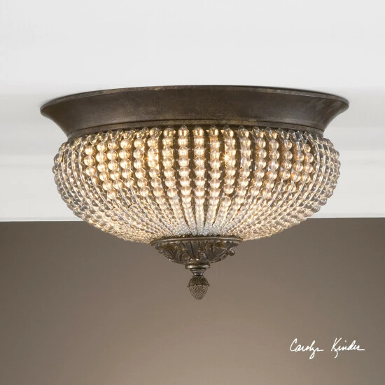 Light filtered through the beautiful beaded-glass cover of this bronze flush mount creates an atmosphere just right for quiet dinners and joyful family gatherings. This beautiful piece from Uttermost features the Victorian feel of oil-rubbed bronze, just right for your traditional or transitional dining room. This bronze flush mount also works well in a foyer, high-ceiling hallway and anywhere you want soft, brilliant illumination.