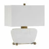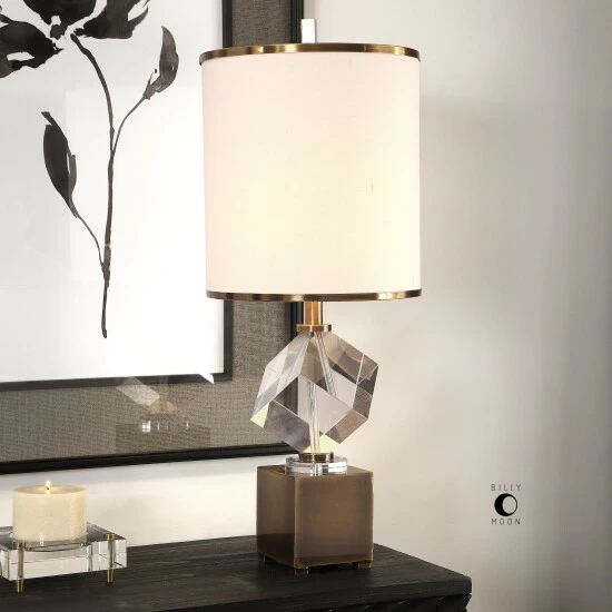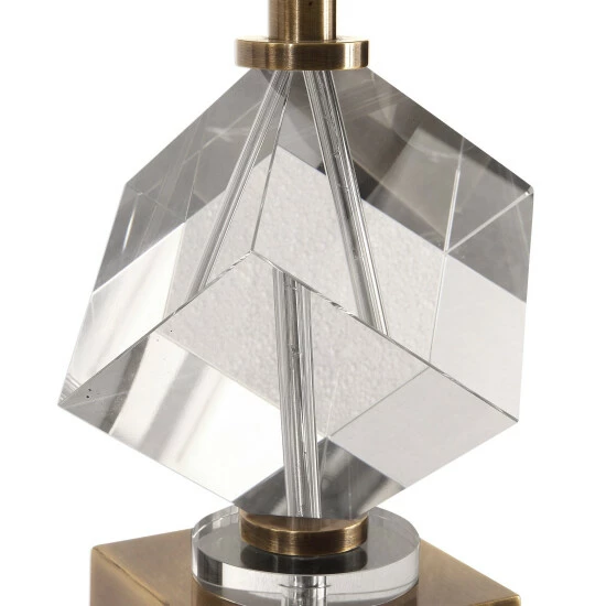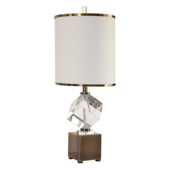 This unique design features a thick crystal cube, balancing on a crystal disk that’s displayed on a chunky steel foot, finished in a plated antique brass. The round hardback drum shade is a white linen fabric with antique brass iron trim.