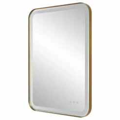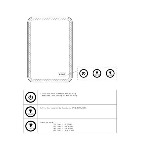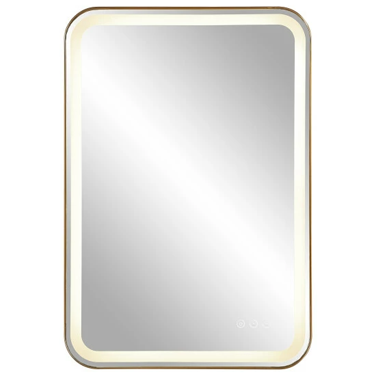 Versatile in design, this vanity mirror has integrated led lighting that illuminates through the frosted strip in the polished edged mirror. The brushed brass plated stainless steel frame is off set from the wall to allow ambient lighting from the back. Easy to use touch buttons are featured on the bottom right of the mirror with an on off function, touch and hold kelvin control from 2700k to 4000k, and touch and hold brightness control. Led lights rated at 40,000 hours. Ships with plug, but can be hardwired professionally.